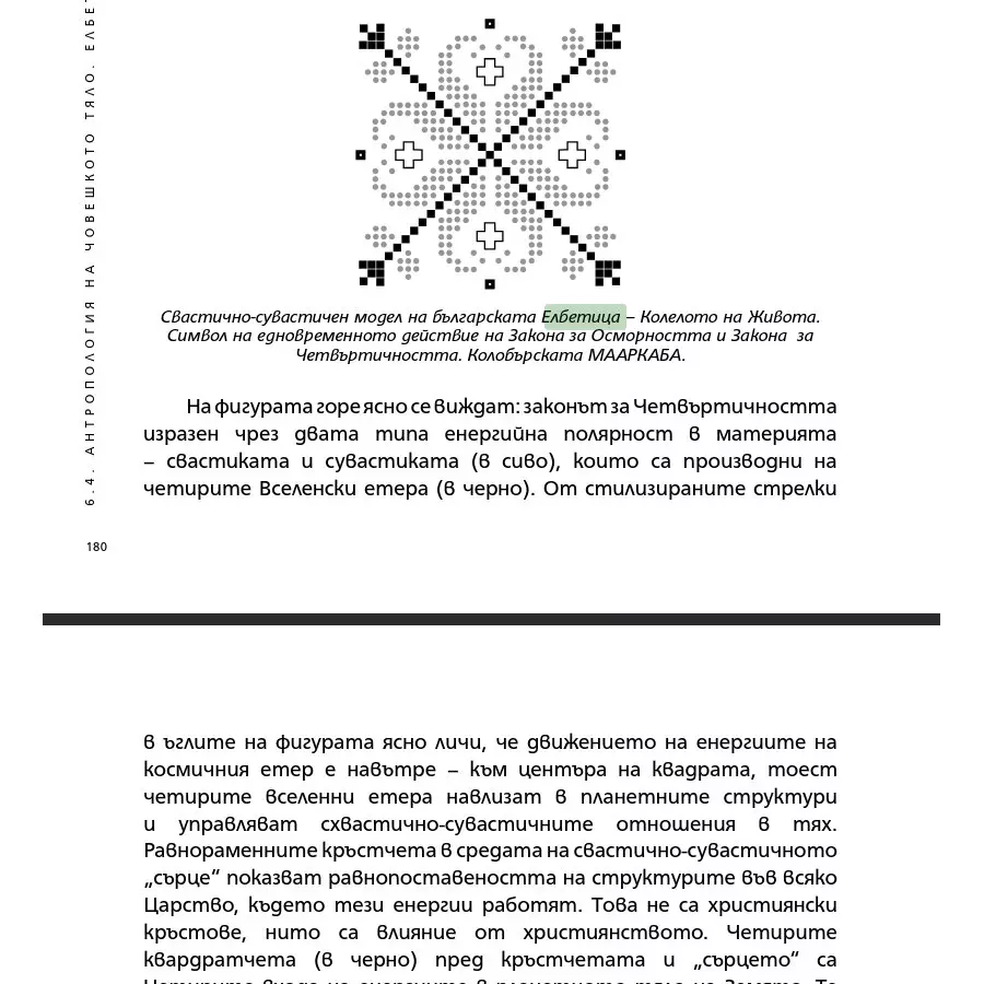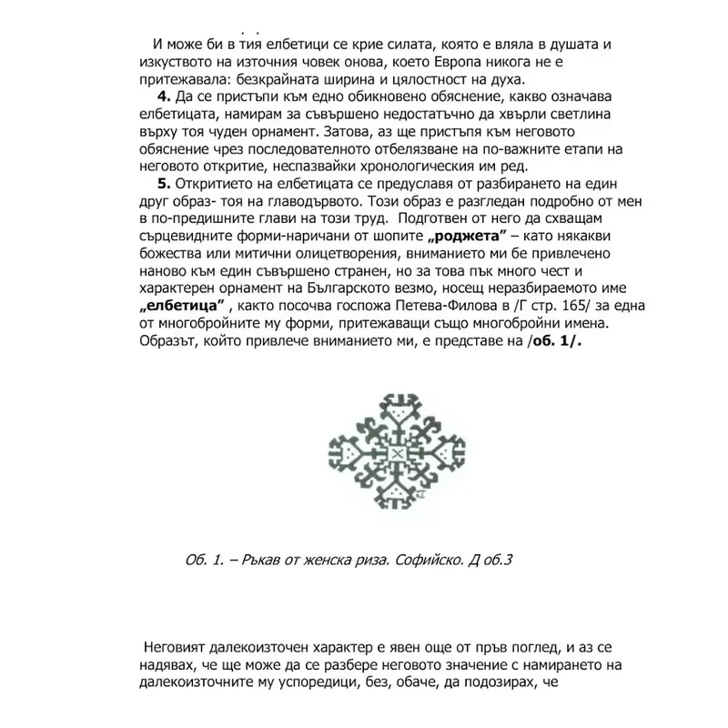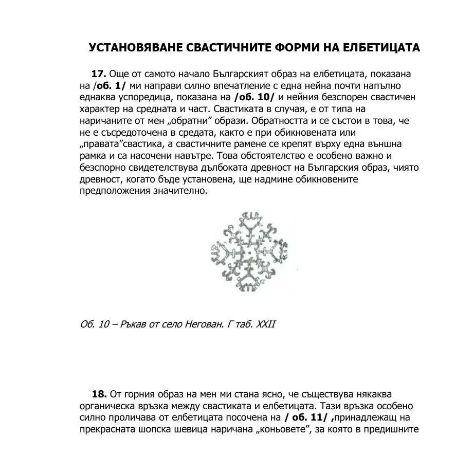 От горния образ на мен ми стана ясно, че съществува някаква органическа връзка между свастиката и елбетицата. Тази връзка особено силно проличава от елбетицата посочена на / об. 11/ ,принадлежащ на прекрасната шопска шевица наричана „коньовете”, за която в предишните глави вече става дума, и безспорно носи един древен далекоизточен облик. Този Български елбетичен образ има, наравно с / об. 1/, решително значение за откритието на елбетицата като символ и знак."