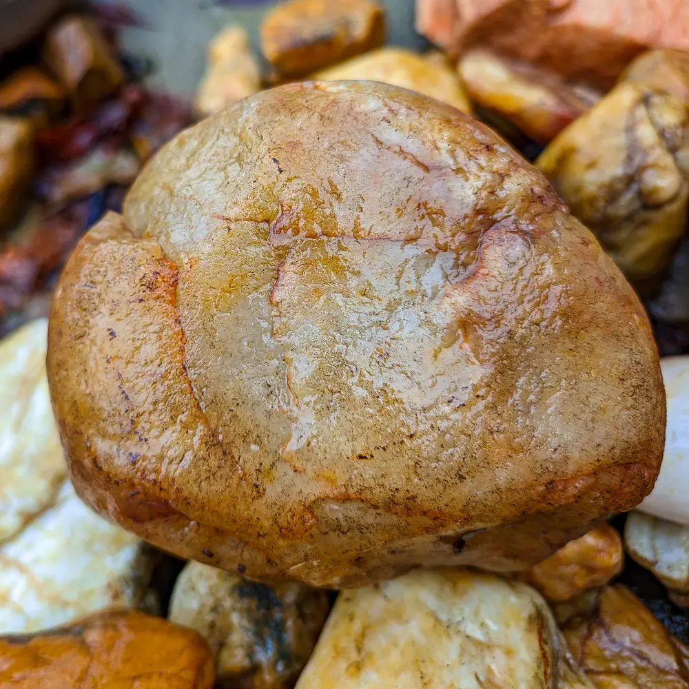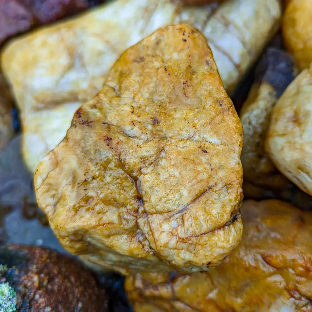 Яспис: Непрозрачен кварц с примеси, които му придават живописни цветове и шарки.