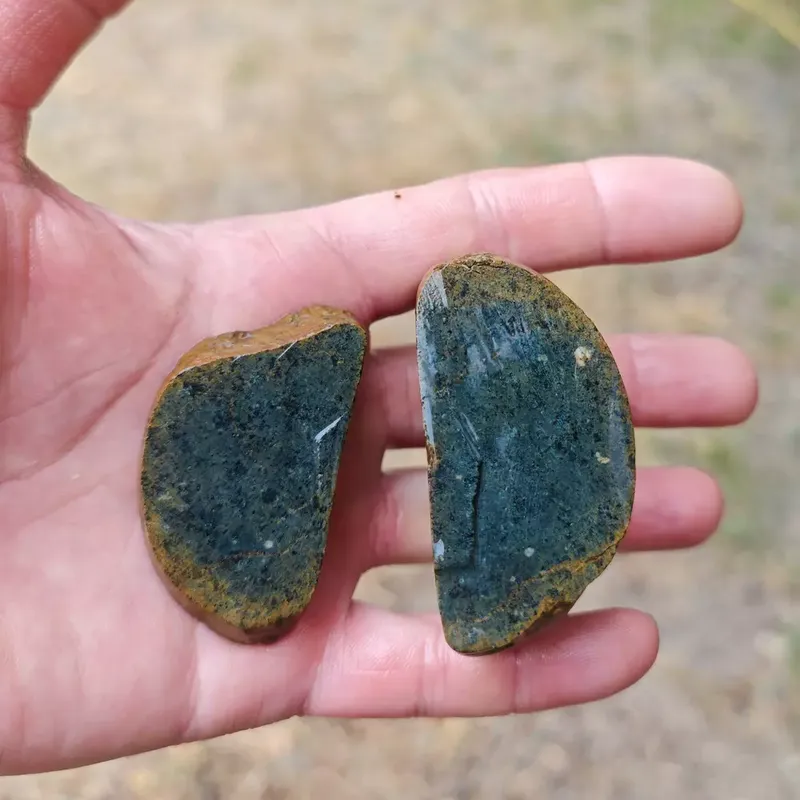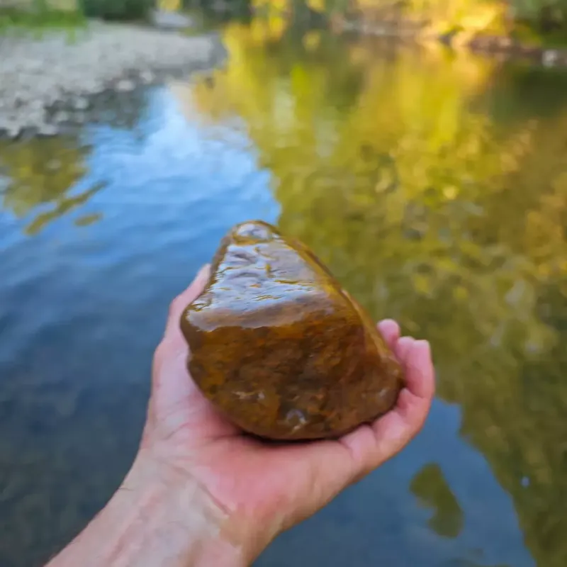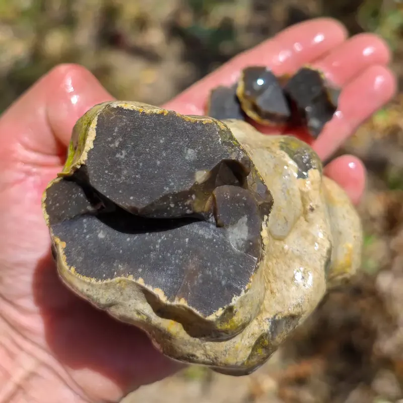 Покрай река Осъм бях намерил едно място с МНОГО от онези жълто - оранжевите Кремъци и там намерих един подобен на тях, но черен на цвят камък, същия по структура и блясък като оранжевите, но отвън покрит със странно изглеждаща по-различна каменна обвивка.IMG 20240627 125236