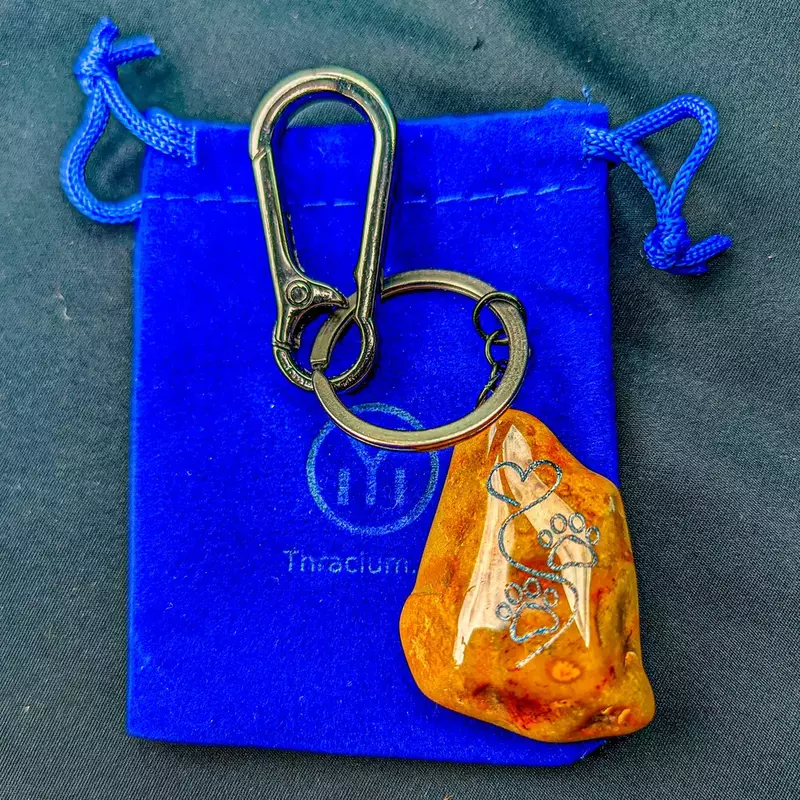 Огледално полиран Жълт Кремък, двустранно лазерно гравирани символи: Куче, Котка, лапички и сърца.